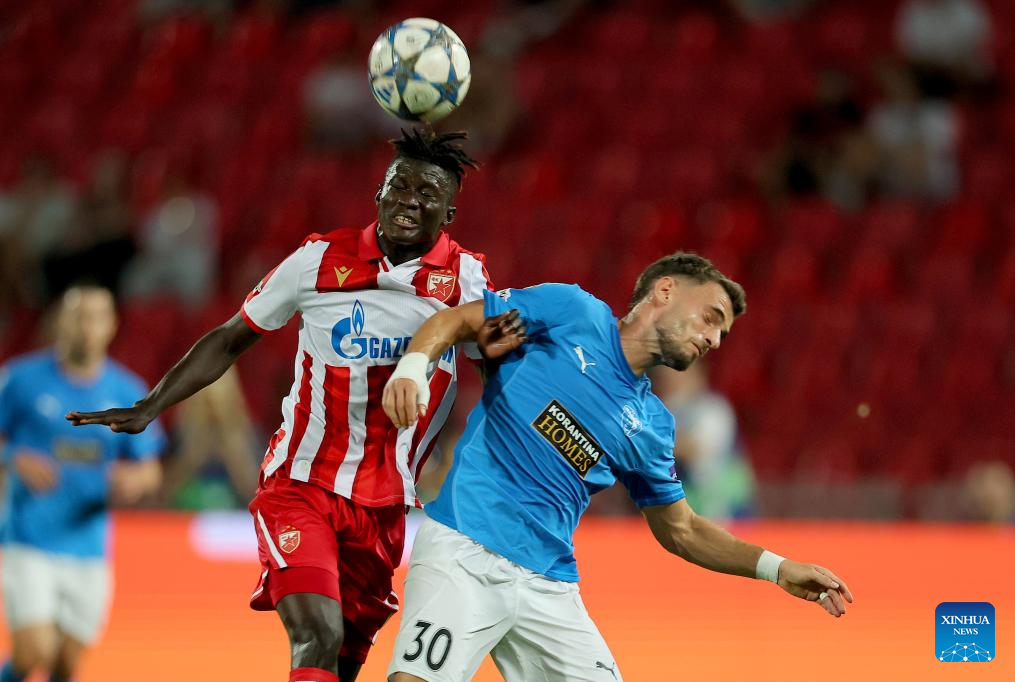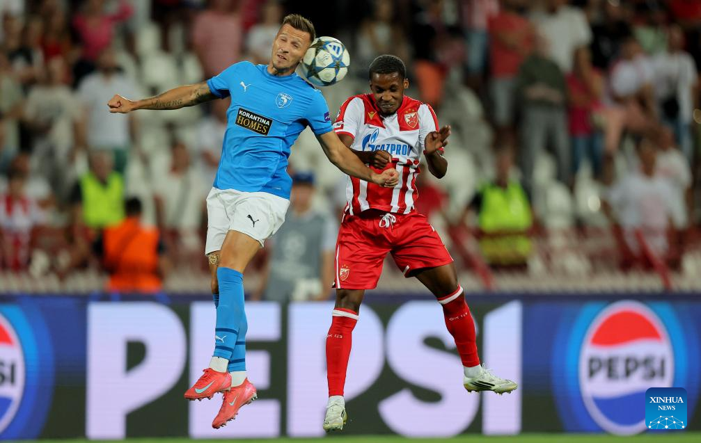 Mahmudu Bajo (L) of Crvena Zvezda vies with Vlad Dragomir of Pafos during the UEFA Champions League play-offs 1st leg football match between Crvena Zvezda and Pafos in Belgrade, Serbia, on Aug. 19, 2025. (Photo by Predrag Milosavljevic/Xinhua)