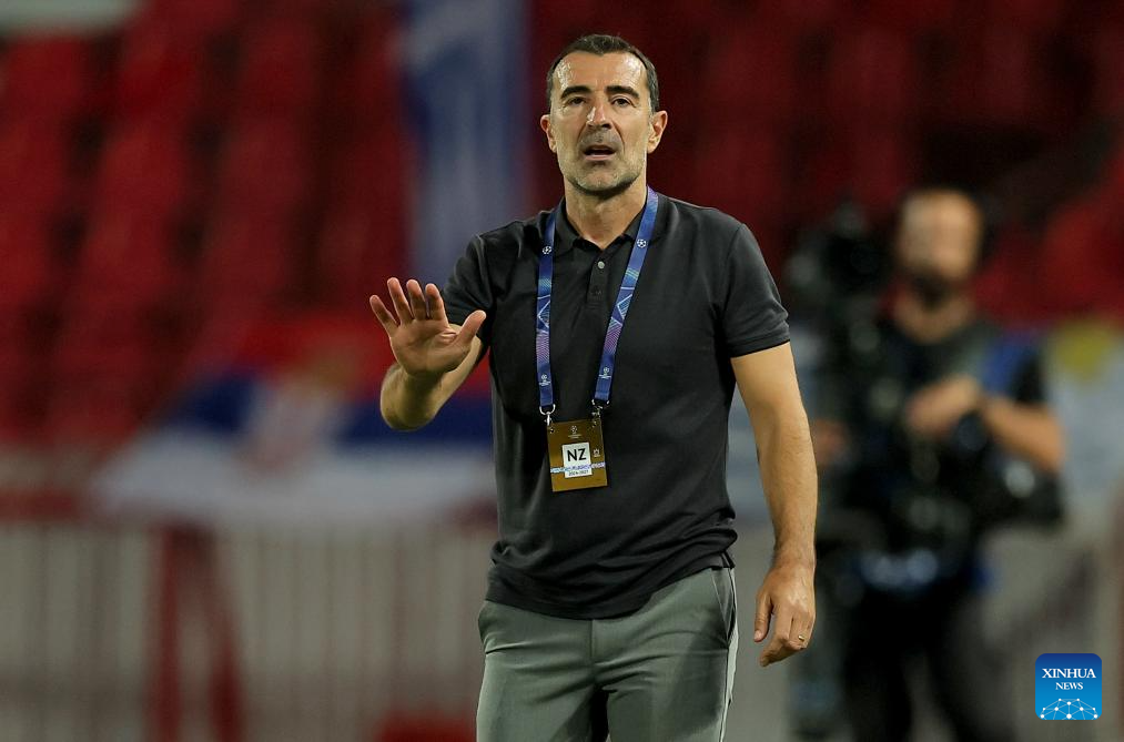 Juan Carlos Carcedo, head coach of Pafos, gestures during the UEFA Champions League play-offs 1st leg football match between Crvena Zvezda and Pafos in Belgrade, Serbia, on Aug. 19, 2025. (Photo by Predrag Milosavljevic/Xinhua)