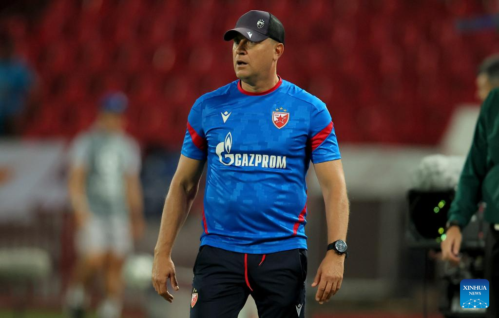 Vladan Milojevic, head coach of Crvena Zvezda, reacts during the UEFA Champions League play-offs 1st leg football match between Crvena Zvezda and Pafos in Belgrade, Serbia, on Aug. 19, 2025. (Photo by Predrag Milosavljevic/Xinhua)