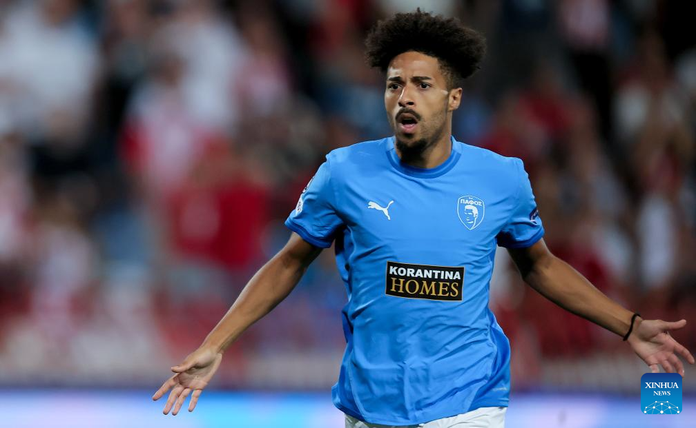 Joao Correia of Pafos celebrates goal during the UEFA Champions League play-offs 1st leg football match between Crvena Zvezda and Pafos in Belgrade, Serbia, on Aug. 19, 2025. (Photo by Predrag Milosavljevic/Xinhua)