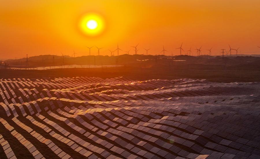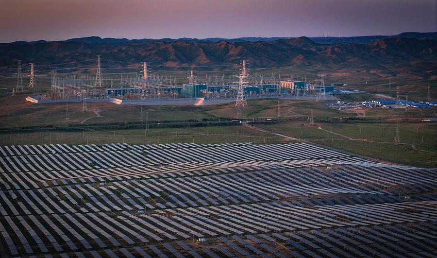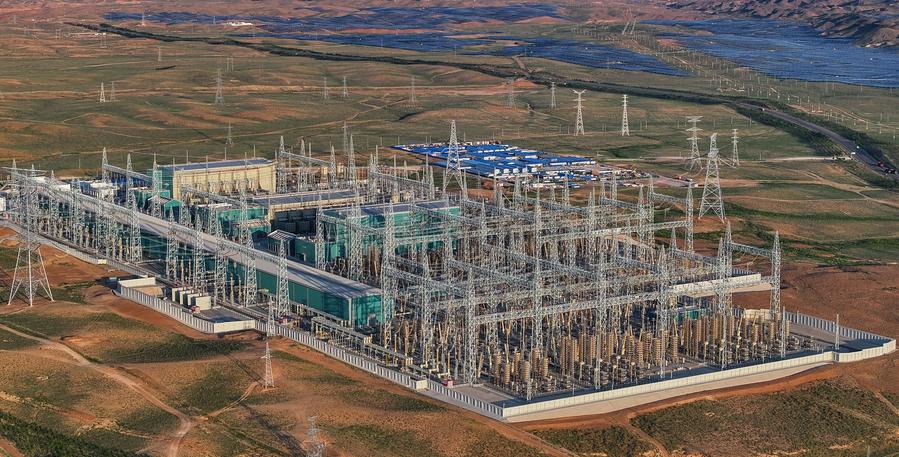 An aerial drone photo taken on Aug. 19, 2025 shows the Zhongning converter station and the supporting new energy project of the Ningxia-Hunan ±800 kV ultra-high voltage (UHV) direct current transmission project in Zhongwei City, northwest China's Ningxia Hui Autonomous Region. (Xinhua/Feng Kaihua)
