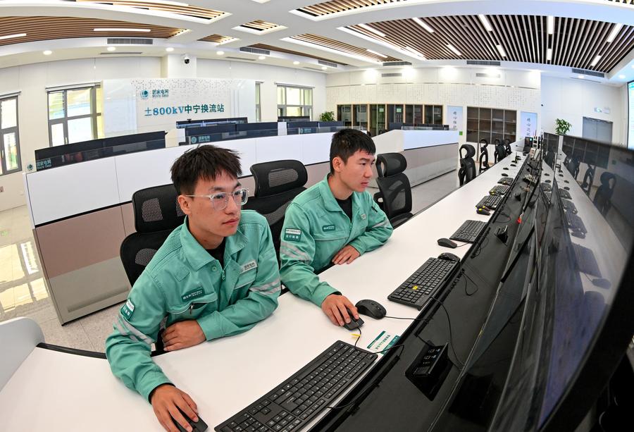 An aerial drone photo taken on Aug. 19, 2025 shows the supporting new energy project of the Ningxia-Hunan ±800 kV ultra-high voltage (UHV) direct current transmission project, in northwest China's Ningxia Hui Autonomous Region. (Xinhua/Feng Kaihua)This photo taken on Aug. 20, 2025 shows the AC filter yard at the Zhongning converter station, the sending end of the Ningxia-Hunan ±800 kV ultra-high voltage (UHV) direct current transmission project in Zhongwei City, northwest China's Ningxia Hui Autonomous Region. (Xinhua/Feng Kaihua)An aerial drone photo taken on Aug. 20, 2025 shows the direct current transmission lines, across the Yellow River, of the Ningxia-Hunan ±800 kV ultra-high voltage (UHV) direct current transmission project in Zhongwei City, northwest China's Ningxia Hui Autonomous Region. (Xinhua/Feng Kaihua)This photo taken on Aug. 20, 2025 shows the pole I low-end converter transformer yard at the Zhongning converter station, the sending end of the Ningxia-Hunan ±800 kV ultra-high voltage (UHV) direct current transmission project in Zhongwei City, northwest China's Ningxia Hui Autonomous Region. (Xinhua/Feng Kaihua)Operation and maintenance personnel perform infrared temperature measurement of the lines that have been put into operation at the Zhongning converter station, the sending end of the Ningxia-Hunan ±800 kV ultra-high voltage (UHV) direct current transmission project in Zhongwei City, northwest China's Ningxia Hui Autonomous Region, Aug. 20, 2025. (Xinhua/Feng Kaihua)Operation and maintenance personnel monitor the operation of equipment in the main control room of the Zhongning converter station, the sending end of the Ningxia-Hunan ±800 kV ultra-high voltage (UHV) direct current transmission project in Zhongwei City, northwest China's Ningxia Hui Autonomous Region, Aug. 20, 2025. (Xinhua/Feng Kaihua)An aerial drone photo taken on Aug. 20, 2025 shows the direct current transmission lines of the Ningxia-Hunan ±800 kV ultra-high voltage (UHV) direct current transmission project in northwest China's Ningxia Hui Autonomous Region. (Xinhua/Feng Kaihua)An aerial drone photo taken on Aug. 20, 2025 shows the Zhongning converter station, the sending end of the Ningxia-Hunan ±800 kV ultra-high voltage (UHV) direct current transmission project in Zhongwei City, northwest China's Ningxia Hui Autonomous Region. (Xinhua/Feng Kaihua)An aerial drone photo taken on Aug. 19, 2025 shows the Zhongning converter station, the sending end of the Ningxia-Hunan ±800 kV ultra-high voltage (UHV) direct current transmission project in Zhongwei City, northwest China's Ningxia Hui Autonomous Region. (Xinhua/Feng Kaihua)Operation and maintenance personnel monitor the operation of equipment in the main control room of the Zhongning converter station, the sending end of the Ningxia-Hunan ±800 kV ultra-high voltage (UHV) direct current transmission project in Zhongwei City, northwest China's Ningxia Hui Autonomous Region, Aug. 20, 2025. (Xinhua/Feng Kaihua)■