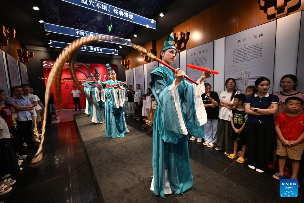 This photo taken on Aug. 20, 2025 shows a scene during a live performance at Hairui cultural park in Haikou, south China's Hainan Province. The park has launched a regular night theater, staging free live performances for visitors. (Xinhua/Pu Xiaoxu)