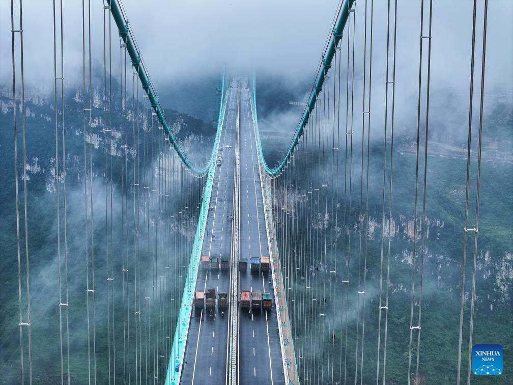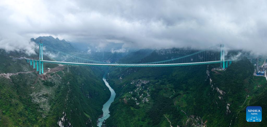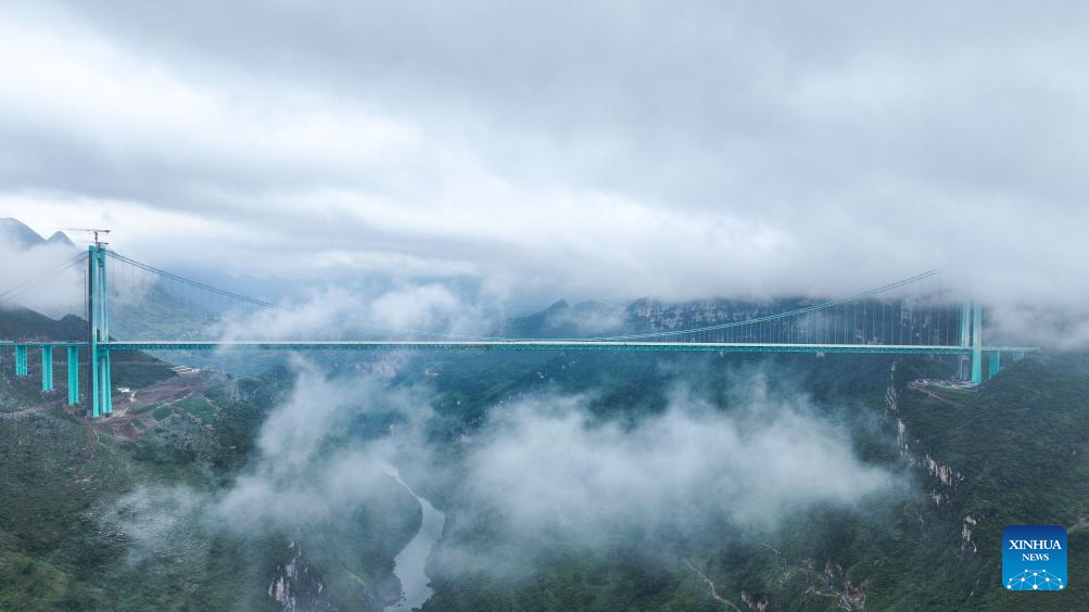 The 2,890-meter bridge, with a span of 1,420 meters, is also the world's largest span bridge to be built in a mountainous area. (Xinhua/Ou Dongqu)