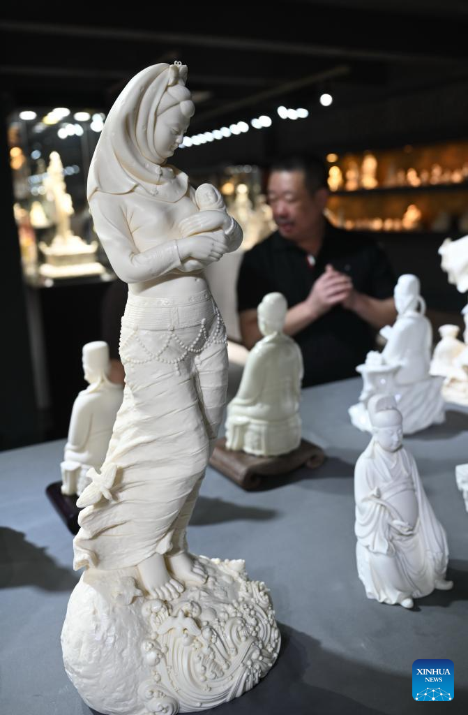 This photo taken on Aug. 20, 2025 shows Lin Jiansheng, a master of Chinese arts and crafts, and his white porcelain artworks exhibited at his studio in Dehua County, southeast China's Fujian Province. Dehua, a county with centuries of ceramic-making history and famed for its white porcelain, is home to over 4,500 ceramic-making enterprises, selling products to more than 190 countries and regions worldwide. To promote Dehua ceramics, the county has established 54 exhibition centers in Belt and Road partner countries and key cities. From January to July this year, the county's ceramic exports has exceeded 2.138 billion yuan (about 297.9 million U.S. dollars) and the ceramic industry cluster has reached a scale of 41.61 billion yuan (about 5.797 billion U.S. dollars), representing a 5.06 percent and 6.8 percent year-on-year increase respectively. (Xinhua/Lin Shanchuan)