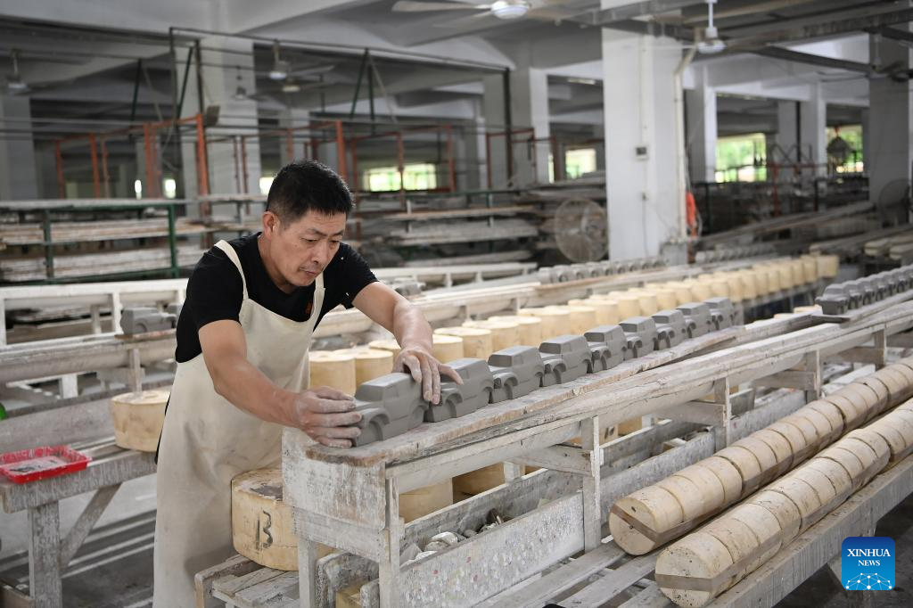 A worker operates at a workshop of Quanzhou Shunmei Group Co., Ltd. in Dehua County, southeast China's Fujian Province, Aug. 20, 2025. Dehua, a county with centuries of ceramic-making history and famed for its white porcelain, is home to over 4,500 ceramic-making enterprises, selling products to more than 190 countries and regions worldwide. To promote Dehua ceramics, the county has established 54 exhibition centers in Belt and Road partner countries and key cities. From January to July this year, the county's ceramic exports has exceeded 2.138 billion yuan (about 297.9 million U.S. dollars) and the ceramic industry cluster has reached a scale of 41.61 billion yuan (about 5.797 billion U.S. dollars), representing a 5.06 percent and 6.8 percent year-on-year increase respectively. (Xinhua/Xiao Xiao)