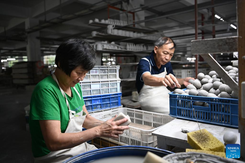 Workers operate at a workshop of Quanzhou Shunmei Group Co., Ltd. in Dehua County, southeast China's Fujian Province, Aug. 20, 2025. Dehua, a county with centuries of ceramic-making history and famed for its white porcelain, is home to over 4,500 ceramic-making enterprises, selling products to more than 190 countries and regions worldwide. To promote Dehua ceramics, the county has established 54 exhibition centers in Belt and Road partner countries and key cities. From January to July this year, the county's ceramic exports has exceeded 2.138 billion yuan (about 297.9 million U.S. dollars) and the ceramic industry cluster has reached a scale of 41.61 billion yuan (about 5.797 billion U.S. dollars), representing a 5.06 percent and 6.8 percent year-on-year increase respectively. (Xinhua/Xiao Xiao)