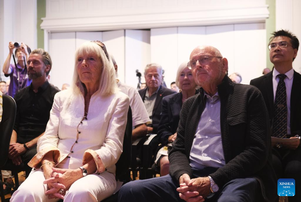 Mariann Arp Andersen (L, front), chairperson of the Sindberg Foundation and Bernhard Arp Sindberg's niece, and Ole Sindberg (R, front), Bernhard Arp Sindberg's half-brother, attend the opening ceremony of the exhibition "My Friend: Bernhard Arp Sindberg" in Copenhagen, Denmark, on Aug. 21, 2025. (Xinhua/Zhang Yuliang)