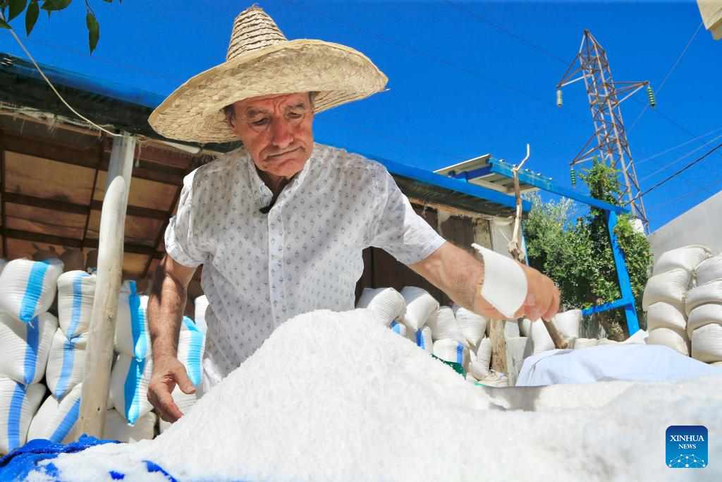 A worker produces salt through traditional sun-drying methods in Anfeh, Lebanon, Aug. 20, 2025. (Photo by Ali Hashisho/Xinhua)