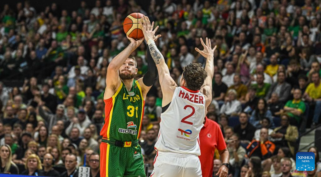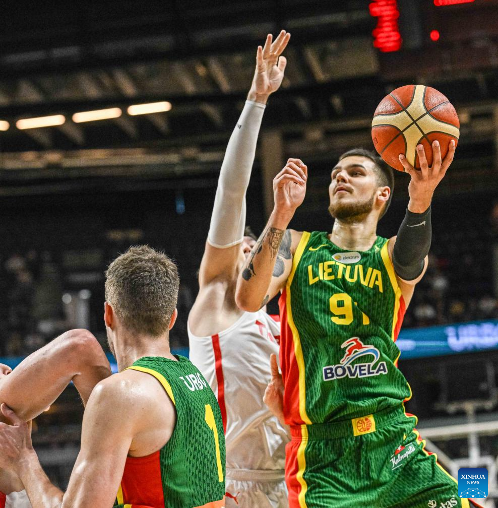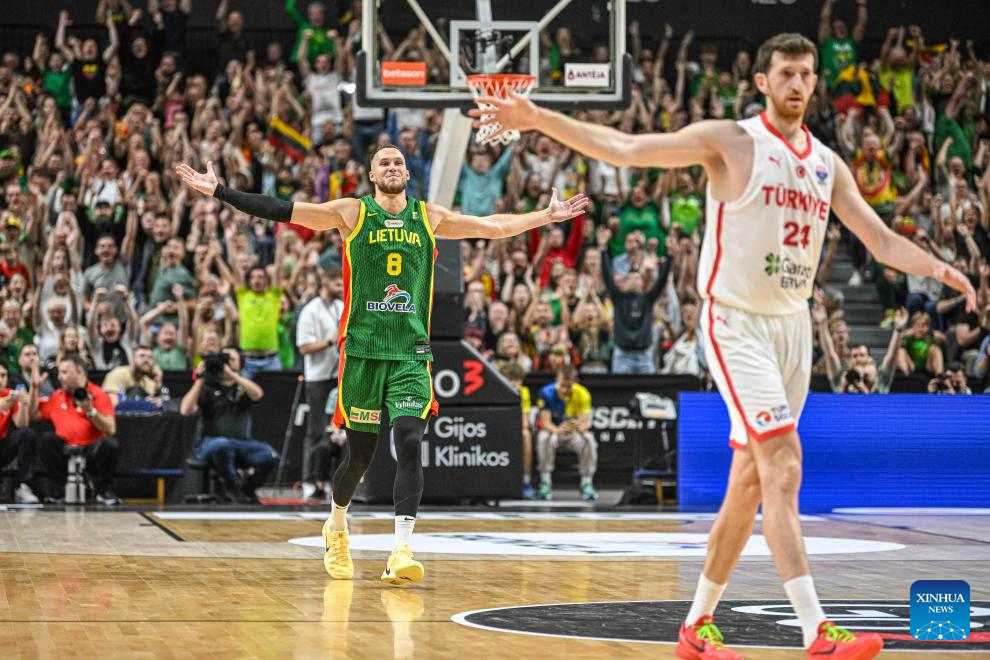 Tadas Sedekerskis (L) of Lithuania reacts after scoring during the 2025 FIBA International Friendly basketball match between Lithuania and Türkiye in Vilnius, Lithuania, Aug. 20, 2025. (Photo by Alfredas Pliadis/Xinhua)