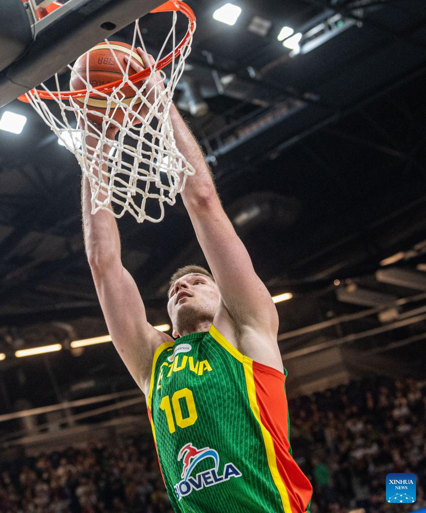 Azuolas Tubelis of Lithuania dunks during the 2025 FIBA International Friendly basketball match between Lithuania and Türkiye in Vilnius, Lithuania, Aug. 20, 2025. (Photo by Alfredas Pliadis/Xinhua)