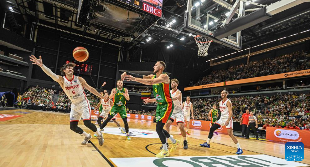 Cedi Osman (1st L) of Türkiye tries to steal the ball during the 2025 FIBA International Friendly basketball match between Lithuania and Türkiye in Vilnius, Lithuania, Aug. 20, 2025. (Photo by Alfredas Pliadis/Xinhua)