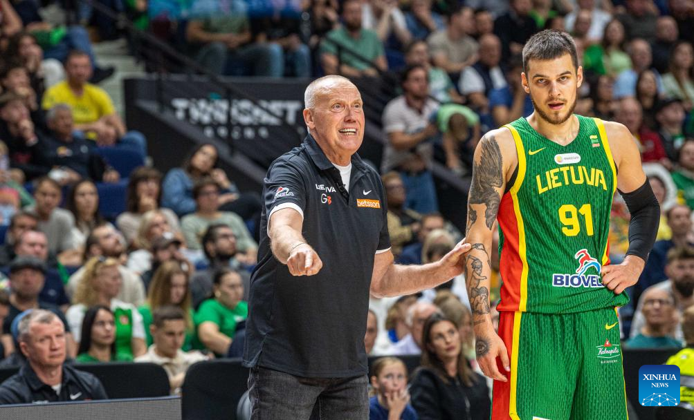 Rimas Kurtinaitis (L), head coach of Lithuania, instructs during the 2025 FIBA International Friendly basketball match between Lithuania and Türkiye in Vilnius, Lithuania, Aug. 20, 2025. (Photo by Alfredas Pliadis/Xinhua)