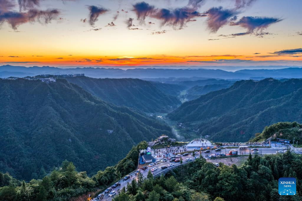 An aerial drone photo shows tourists watching the sunset at an observation platform in Huangshui Town of Shizhu County, southwest China's Chongqing Municipality, Aug. 20, 2025. Huangshui has turned itself into a well noted tourist destination by taking full advantage of local forest and landscape resources. So far this year, the town has received 16 million visitors, who brought in a combined revenue of 11.2 billion yuan (1.56 billion U.S. dollars). (Xinhua/Tang Yi)