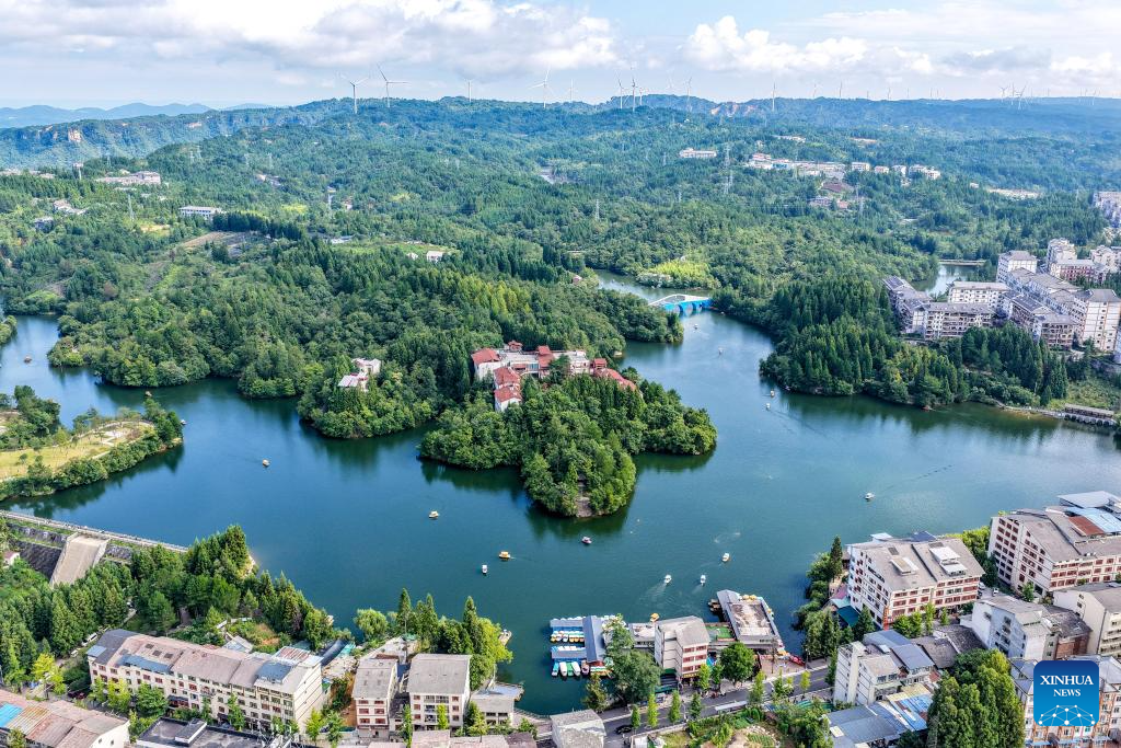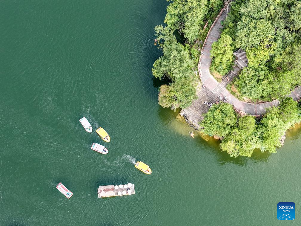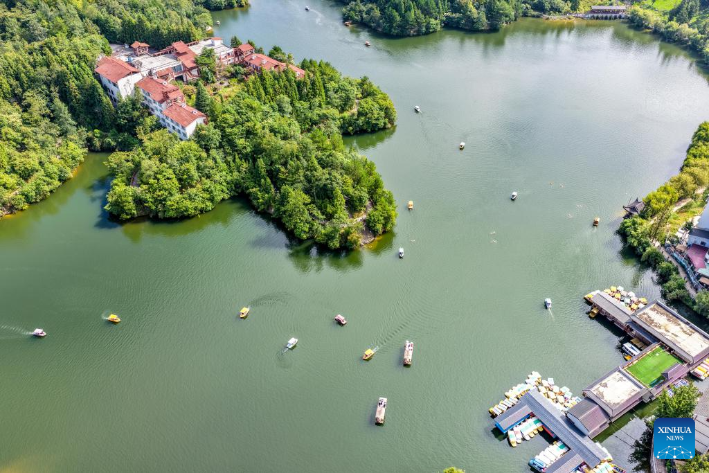 An aerial drone photo shows tourists taking boats on a lake in Huangshui Town of Shizhu County, southwest China's Chongqing Municipality, Aug. 21, 2025. Huangshui has turned itself into a well noted tourist destination by taking full advantage of local forest and landscape resources. So far this year, the town has received 16 million visitors, who brought in a combined revenue of 11.2 billion yuan (1.56 billion U.S. dollars). (Xinhua/Tang Yi)