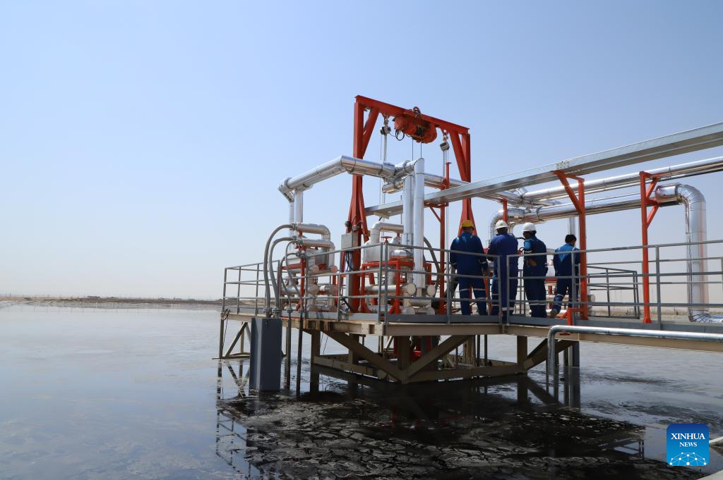 Workers are seen at an oil lake crude recovery project led by China's Jereh Group in Ahmadi Governorate, Kuwait, Aug. 20, 2025. Kuwait has kicked off a major environmental cleanup effort as the first unit of an oil lake crude recovery project led by Jereh completed its trial run Wednesday. (Xinhua/Yin Ke)
