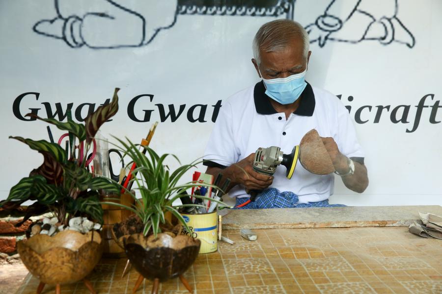 Among the artisans is 71-year-old Aung Kyaw Oo, who has been making coconut shell-based products for about six years. "I enjoy making handicrafts because I'm passionate about this work," he said while polishing raw coconut shells into smooth surfaces.