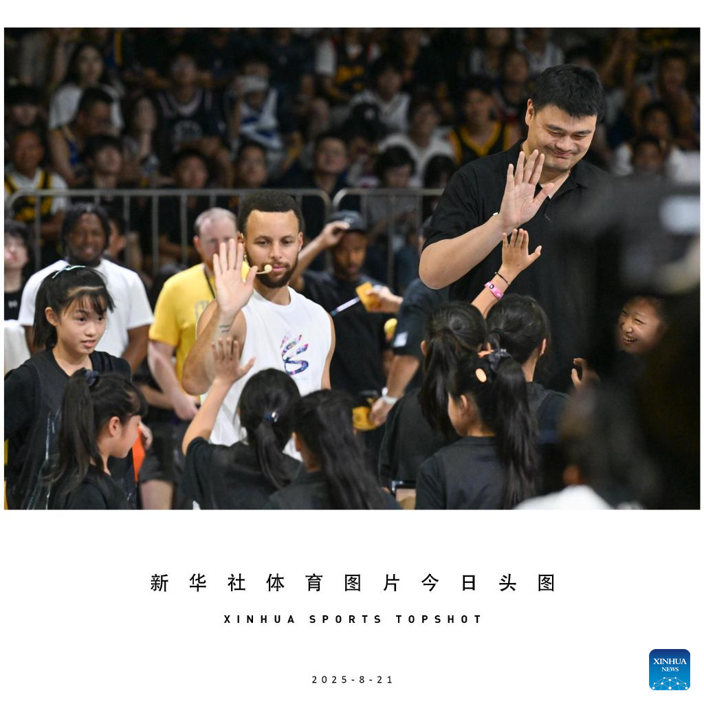 Yao Ming (top R) and Stephen Curry (top C) react with children during the NBA star Stephen Curry's Asia tour in southwest China's Chongqing Municipality, Aug. 20, 2025. (Xinhua/Chen Cheng)