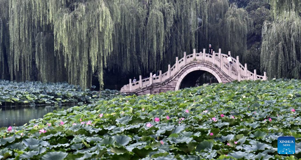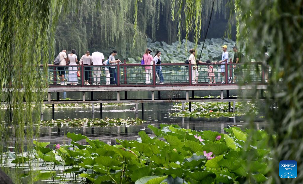 Tourists view lotus flowers at Yuanmingyuan Park in Beijing, capital of China, on Aug. 21, 2025. (Xinhua/Li Xin)