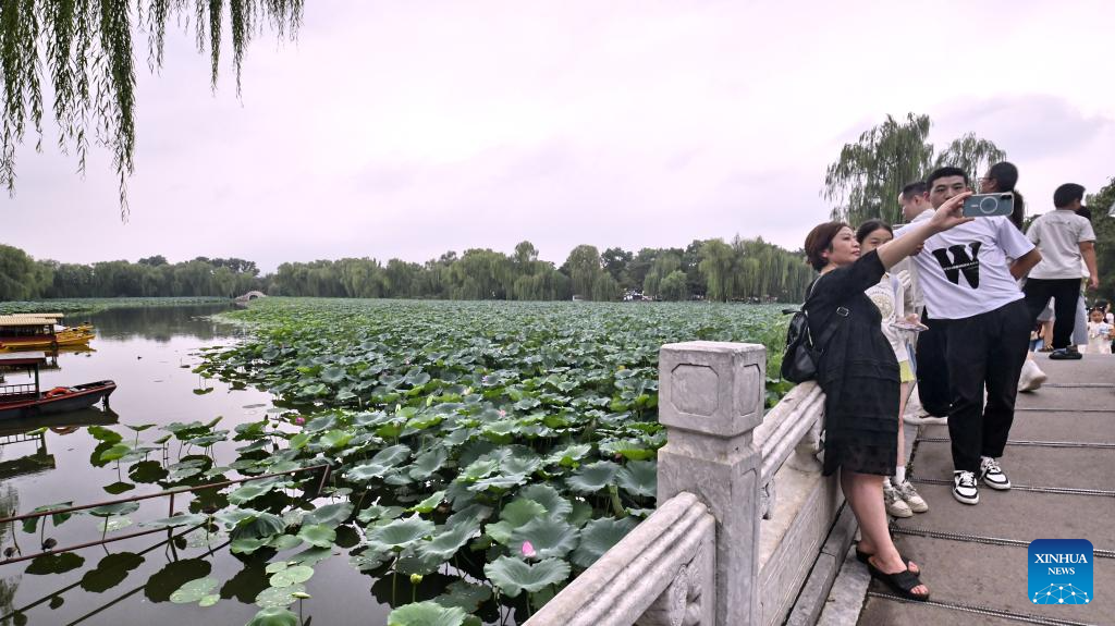 Tourists take selfies in front of a lotus pond at Yuanmingyuan Park in Beijing, capital of China, on Aug. 21, 2025. (Xinhua/Li Xin)