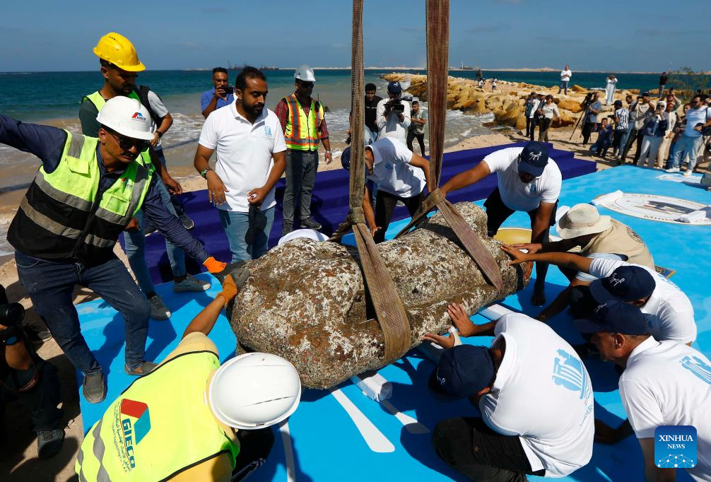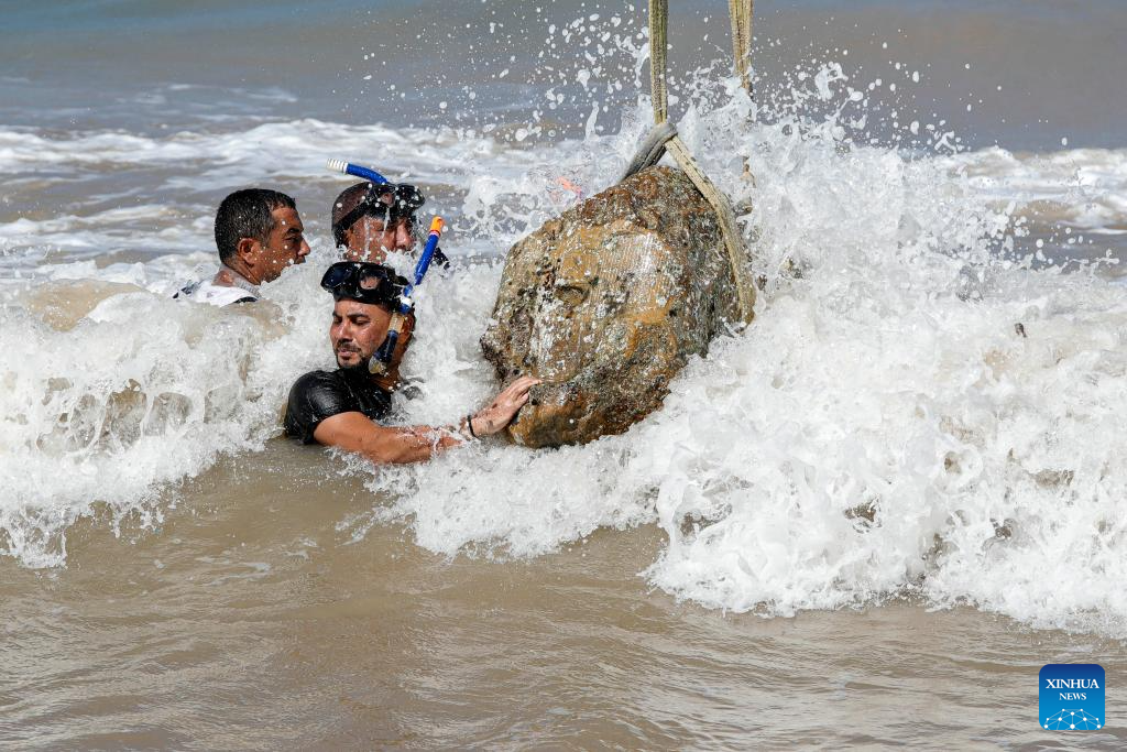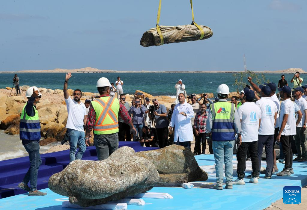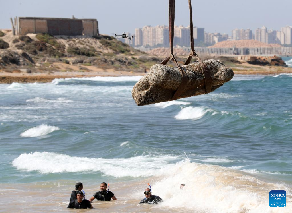 Artifacts are recovered from the Mediterranean Sea at Abu Qir Bay in Alexandria, Egypt, on Aug. 21, 2025. The Egyptian Ministry of Tourism and Antiquities on Thursday successfully retrieved three massive artifacts from the Mediterranean Sea off Abu Qir Bay in Alexandria governorate. (Xinhua/Sui Xiankai)
