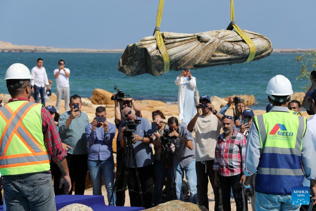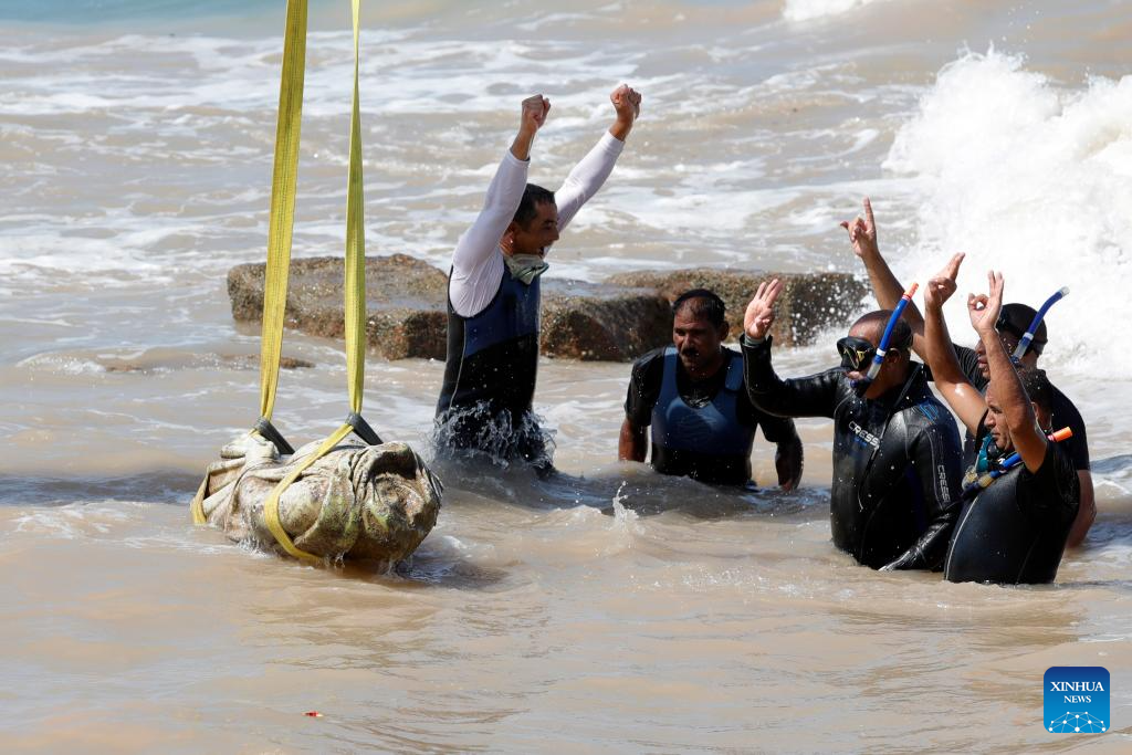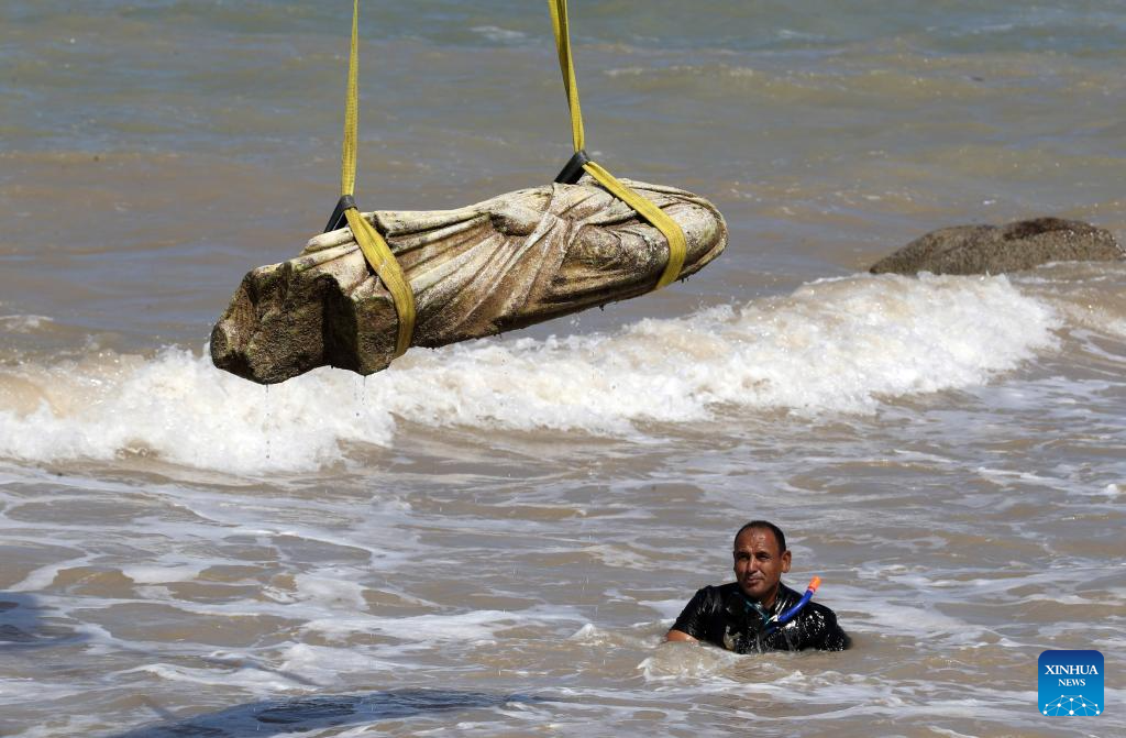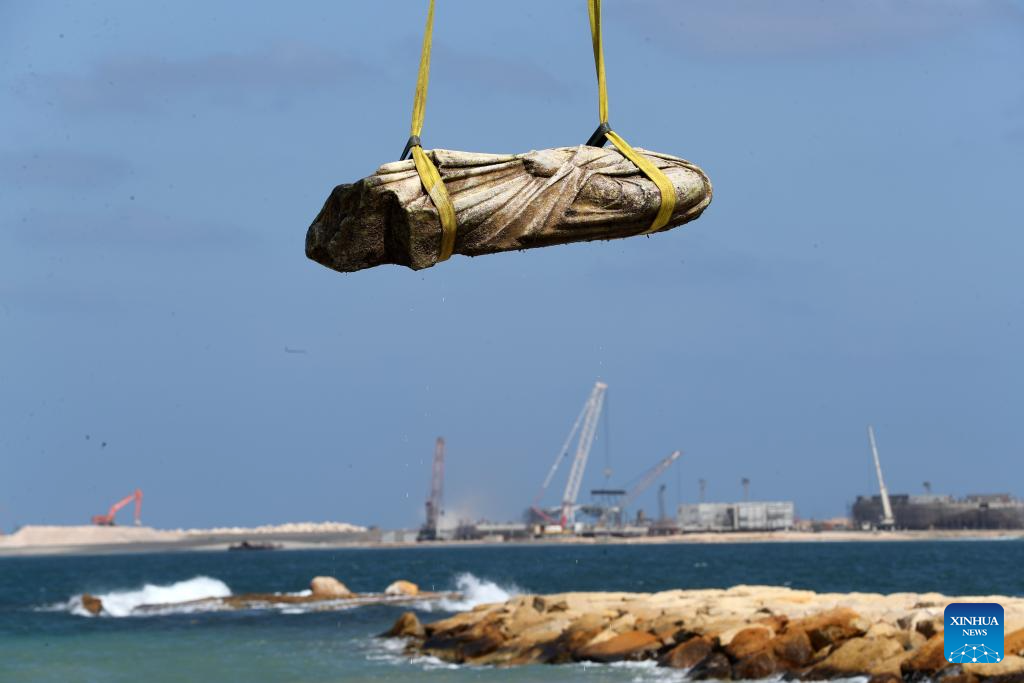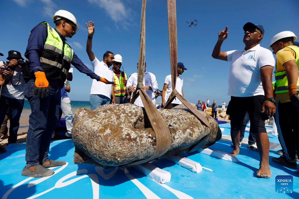 Artifacts are recovered from the Mediterranean Sea at Abu Qir Bay in Alexandria, Egypt, on Aug. 21, 2025. The Egyptian Ministry of Tourism and Antiquities on Thursday successfully retrieved three massive artifacts from the Mediterranean Sea off Abu Qir Bay in Alexandria governorate. (Xinhua/Sui Xiankai)