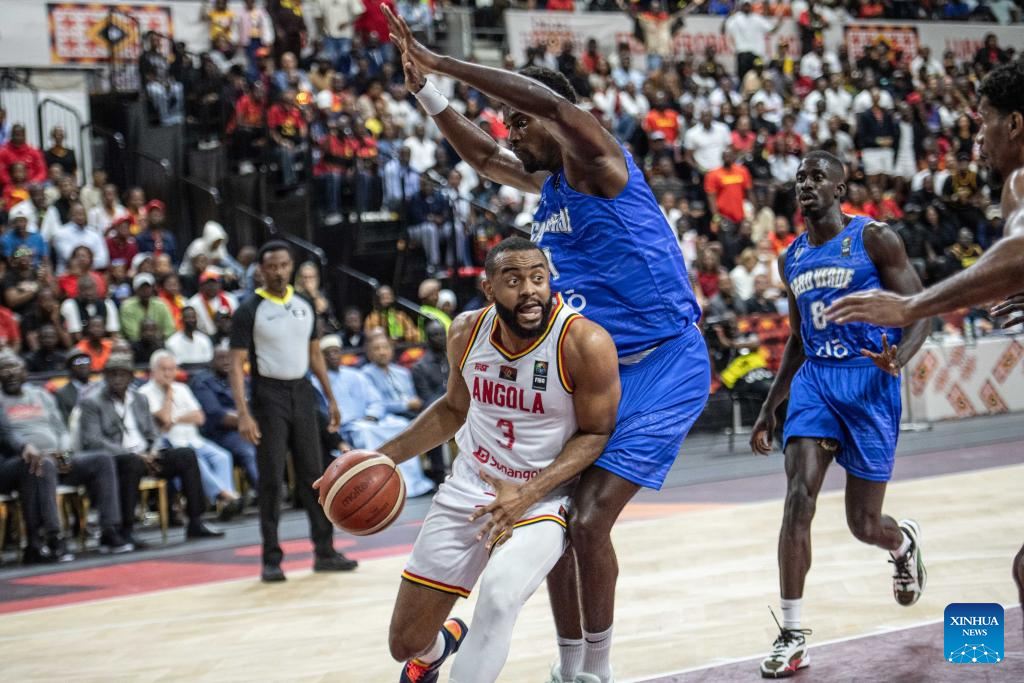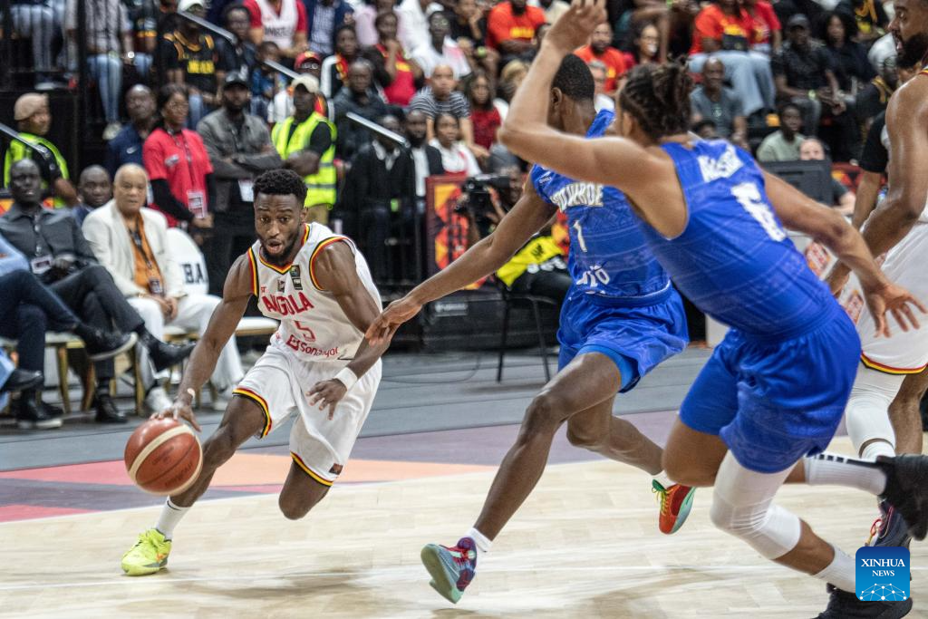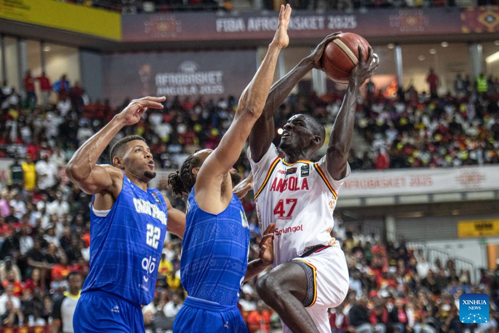 Angola's Gerson Goncalves (L) breaks through during the quarterfinal between Angola and Cape Verde at the FIBA AfroBasket 2025 in Luanda, Angola, Aug. 21, 2025. (Xinhua/Wang Guansen)