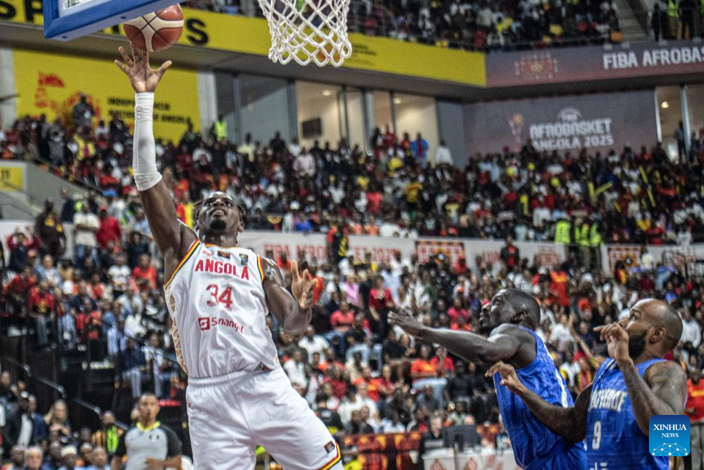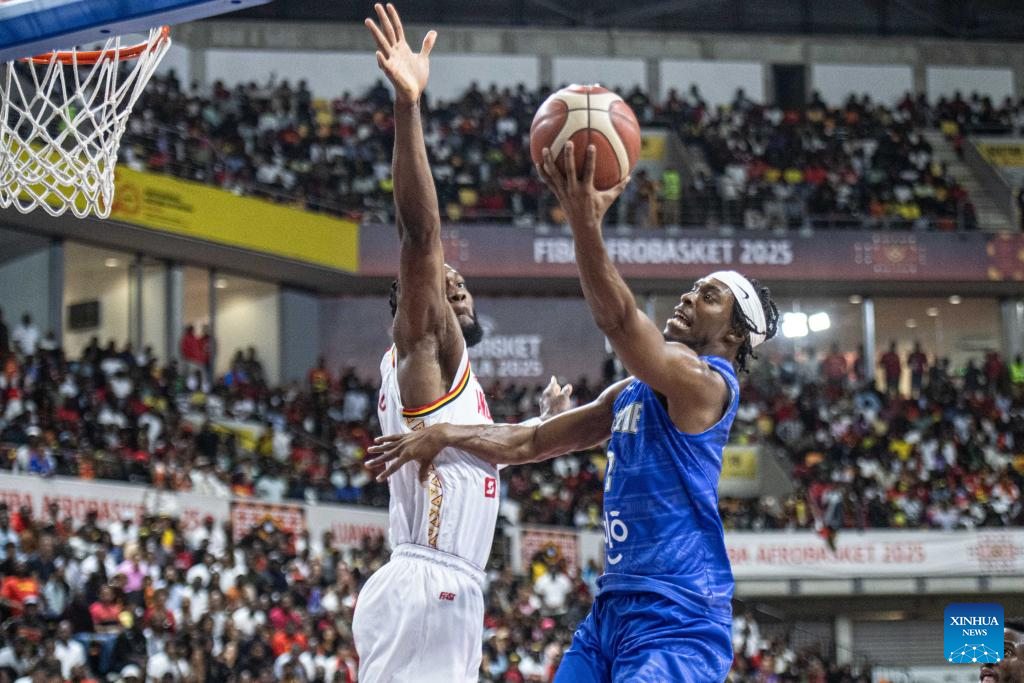 Angola's Kevin Kokila (L) goes for a lay-up during the quarterfinal between Angola and Cape Verde at the FIBA AfroBasket 2025 in Luanda, Angola, Aug. 21, 2025. (Xinhua/Wang Guansen)