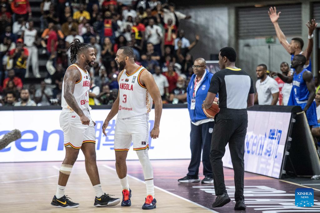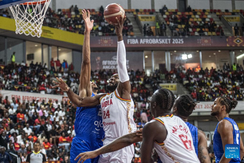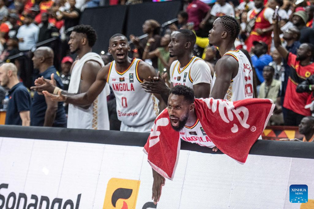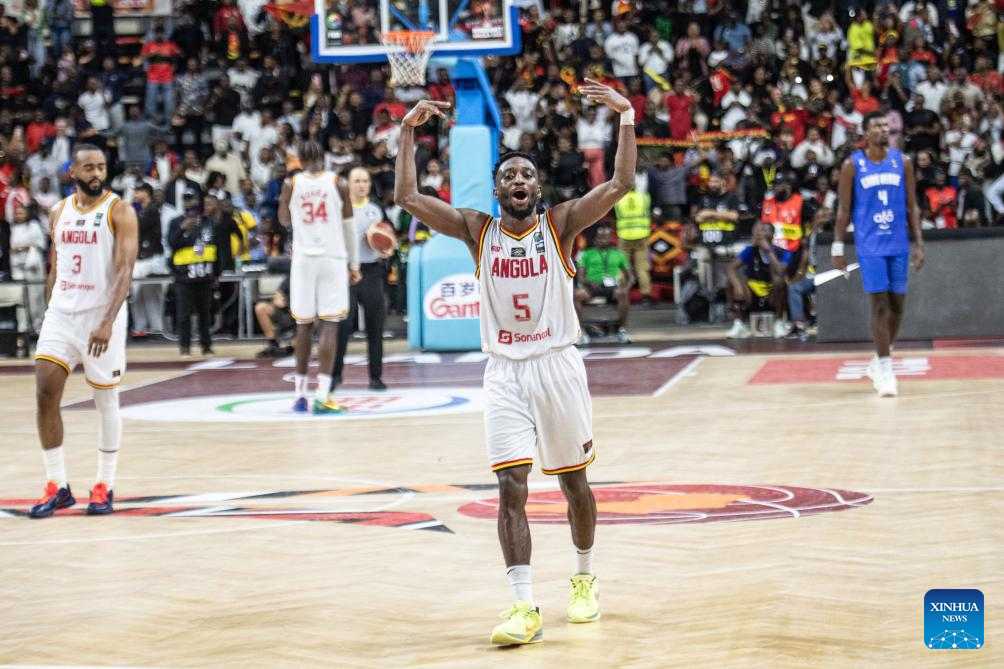 Angola's Childe Dundao (Front) celebrates during the quarterfinal between Angola and Cape Verde at the FIBA AfroBasket 2025 in Luanda, Angola, Aug. 21, 2025. (Xinhua/Wang Guansen)