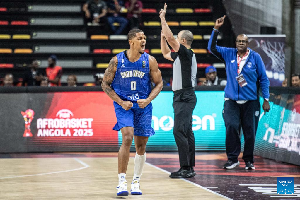 Cape Verde's Patrick Lima celebrates scoring during the quarterfinal between Angola and Cape Verde at the FIBA AfroBasket 2025 in Luanda, Angola, Aug. 21, 2025. (Xinhua/Wang Guansen)