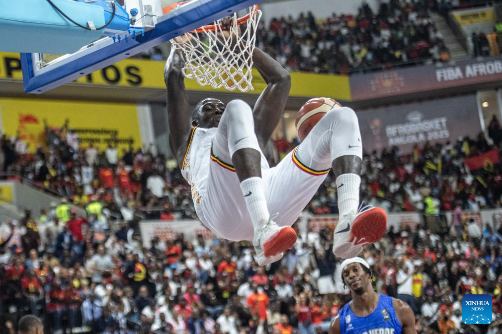Angola's Jilson Bango dunks during the quarterfinal between Angola and Cape Verde at the FIBA AfroBasket 2025 in Luanda, Angola, Aug. 21, 2025. (Xinhua/Wang Guansen)