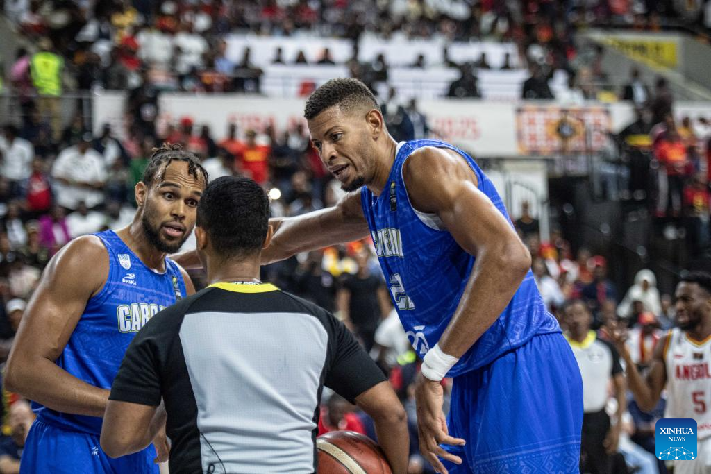 Cape Verde's Edy Tavares (R) and Ivan Almeida (L) argue with the referee during the quarterfinal between Angola and Cape Verde at the FIBA AfroBasket 2025 in Luanda, Angola, Aug. 21, 2025. (Xinhua/Wang Guansen)