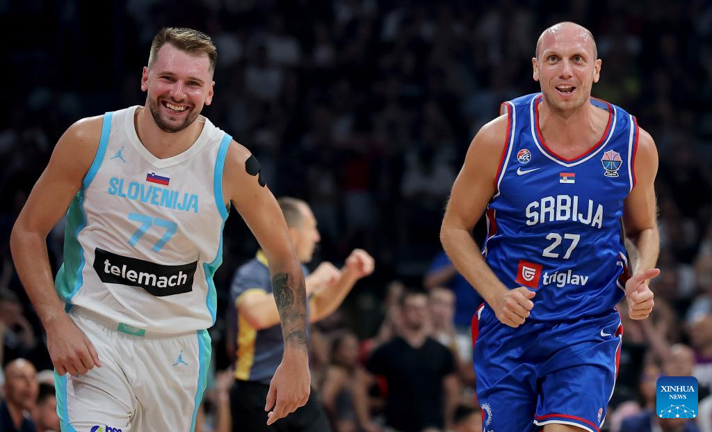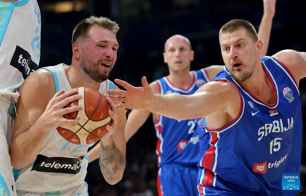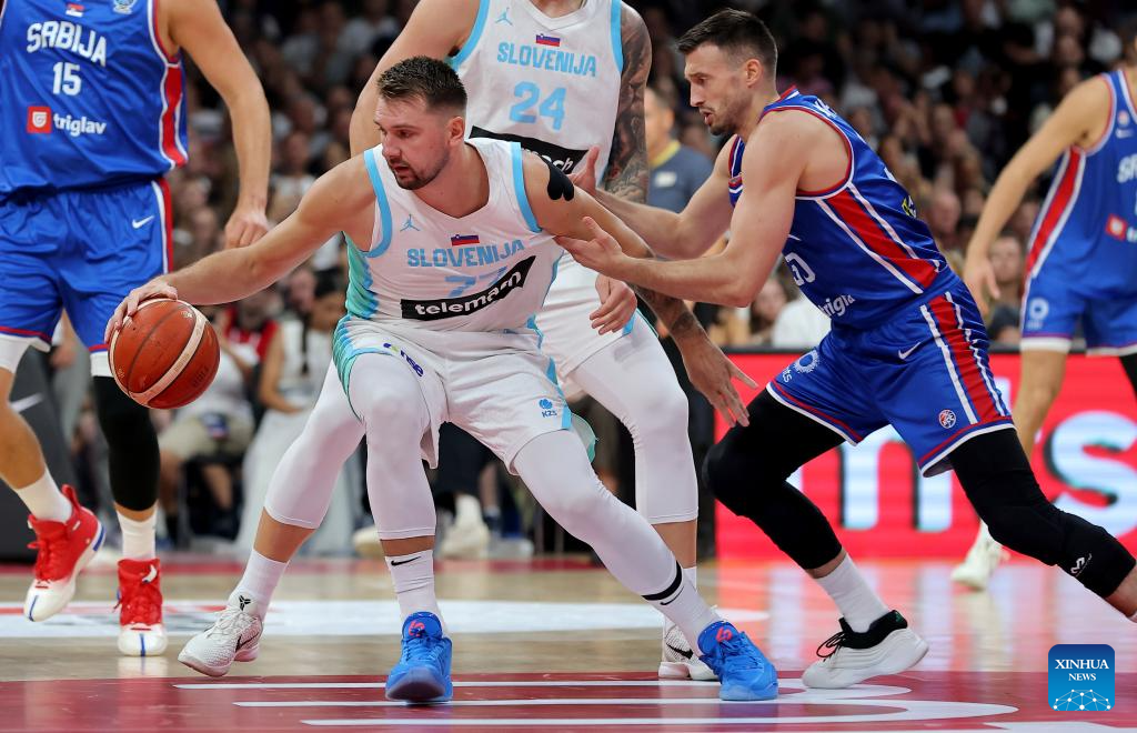 Slovenia's Luka Doncic (L) competes with Serbia's Aleksa Avramovic during a warm-up match for FIBA Eurobasket 2025 in Belgrade, Serbia on Aug. 21, 2025. (Photo by Predrag Milosavljevic/Xinhua)