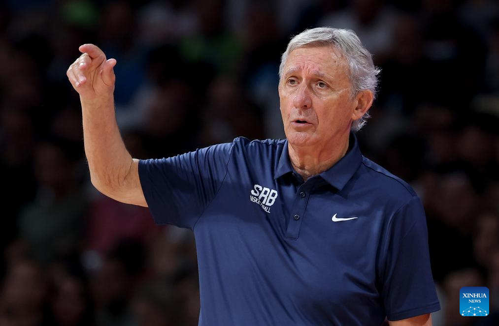 Serbia's head coach Svetislav Pesic gestures during a warm-up match for FIBA Eurobasket 2025 in Belgrade, Serbia on Aug. 21, 2025. (Photo by Predrag Milosavljevic/Xinhua)