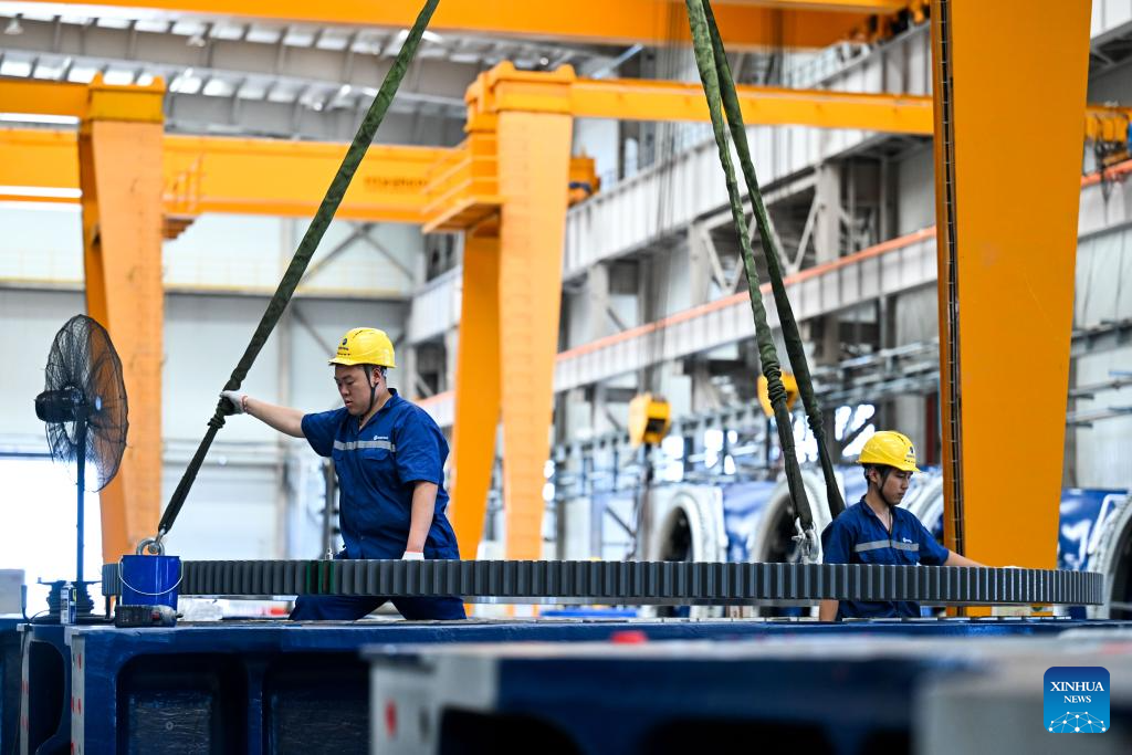 Workers are busy at the general assembly workshop in the Mingyang New Energy Intelligent Manufacturing Industrial Park in Baotou, north China's Inner Mongolia Autonomous Region, July 29, 2025.