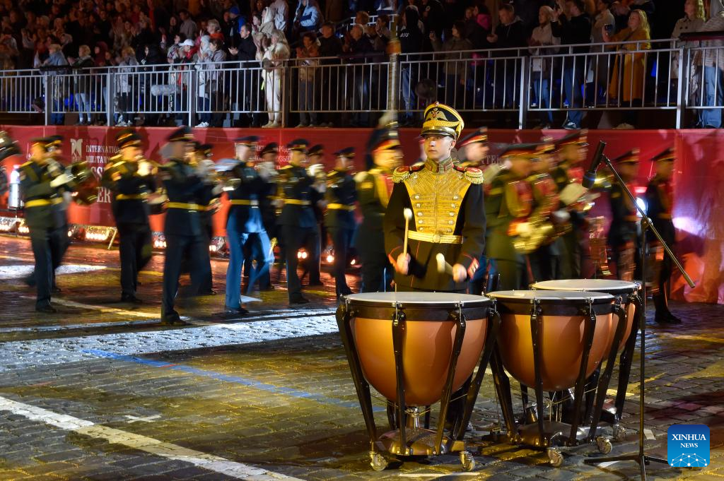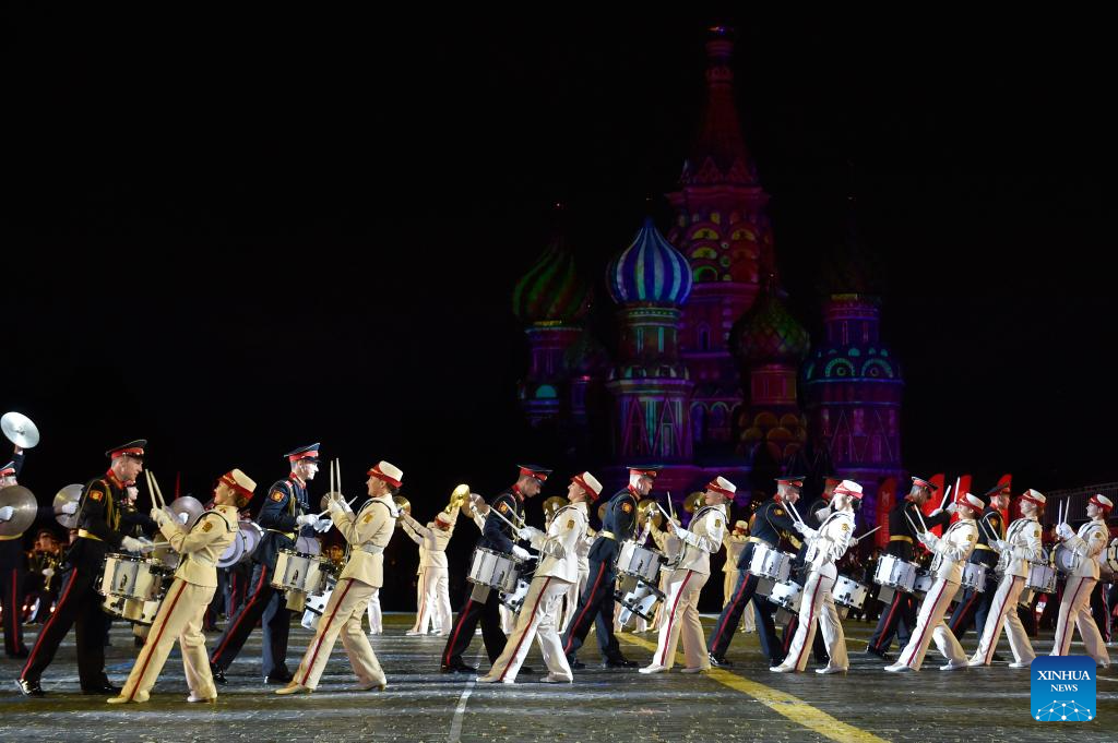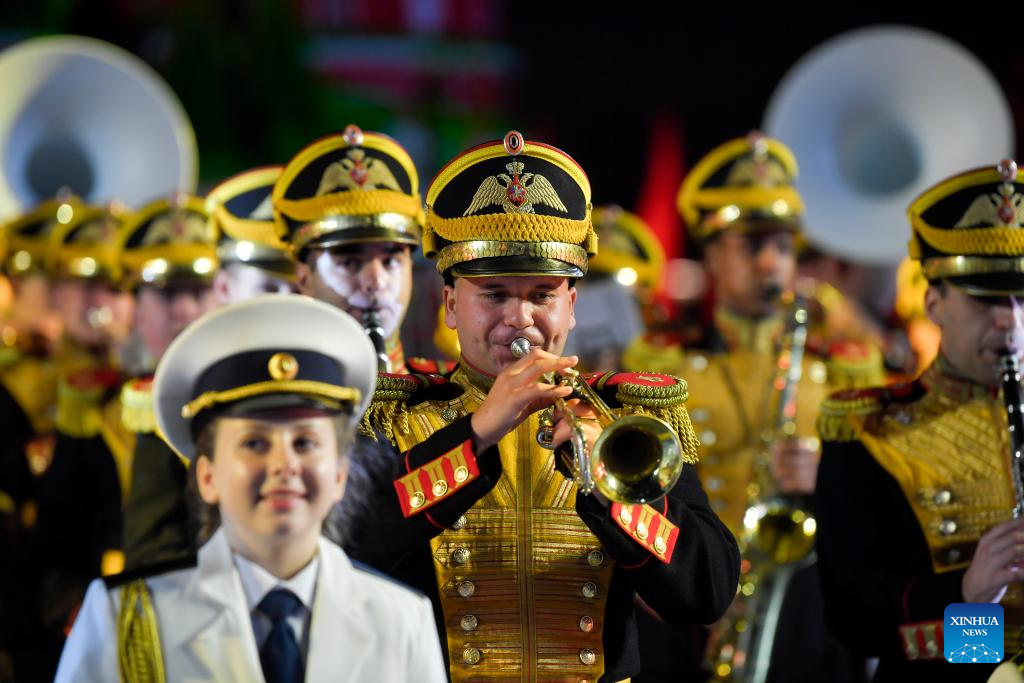 A military band performs at the "Spasskaya Tower" International Military Music Festival in Moscow, Russia, Aug. 22, 2025.