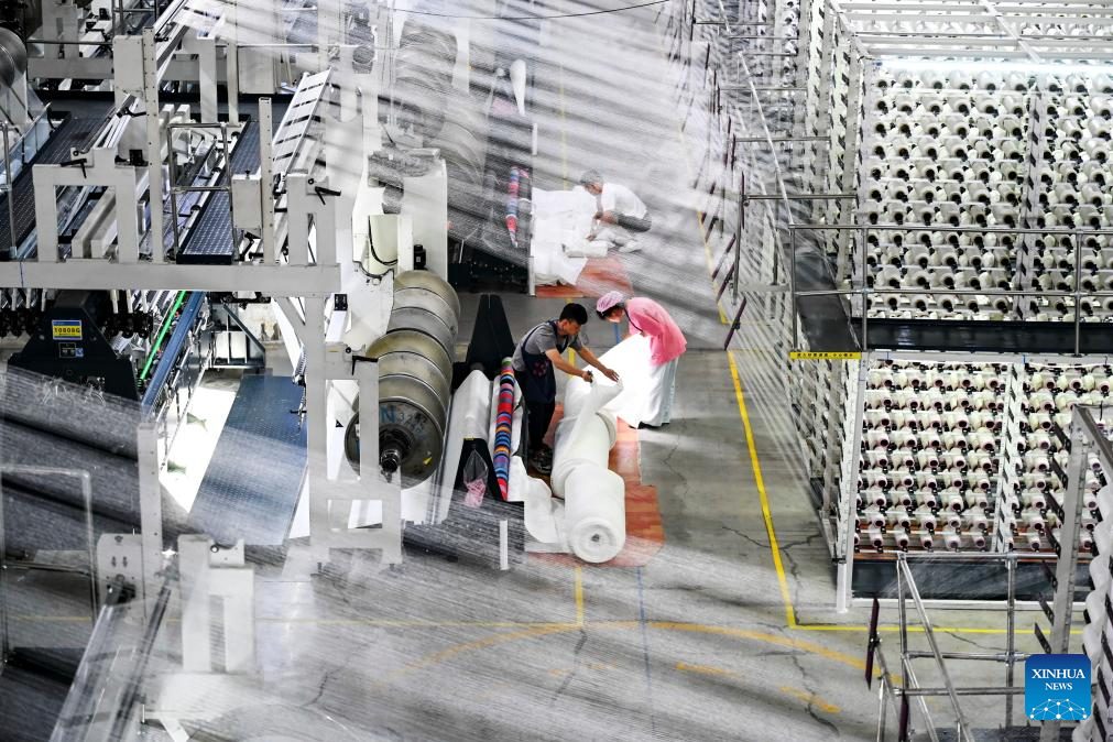 This photo taken on Aug. 20, 2025 shows a scene at the smart workshop of SinceTech, a shoe material textile company, in Jinjiang, southeast China's Fujian Province.