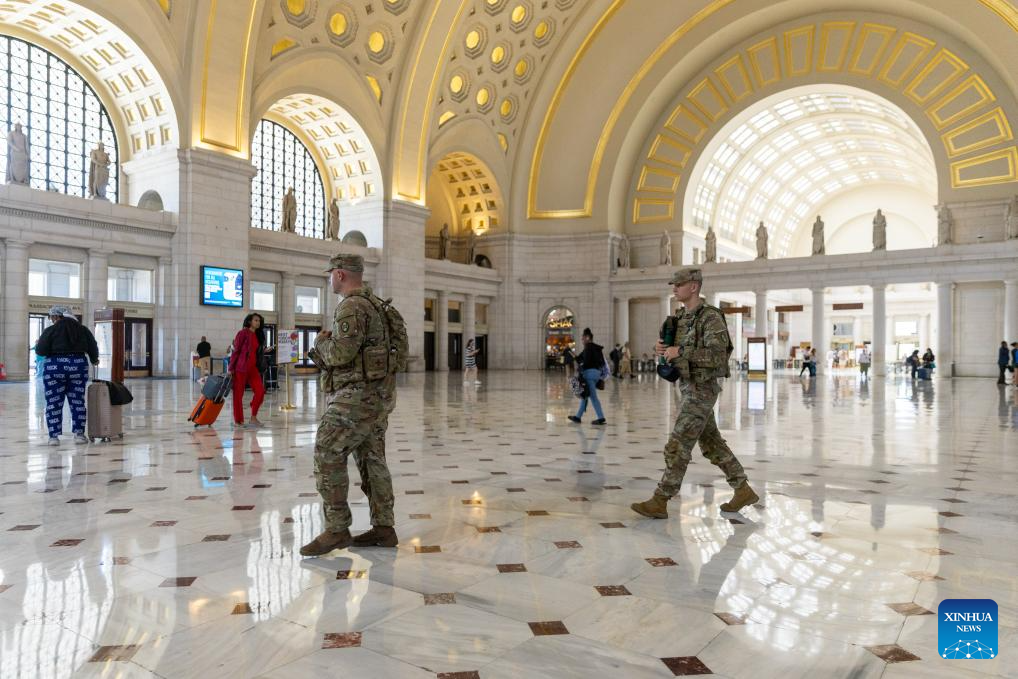 Members of the National Guard patrol inside Union Station in Washington, D.C., the United States, Aug. 22, 2025. (Xinhua/Hu Yousong)