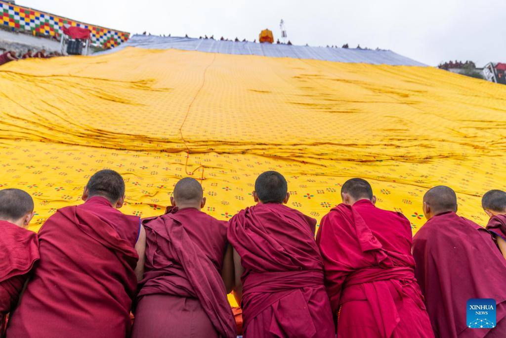 A ritual marking the start of the Shoton Festival is held at the Drepung Monastery in Lhasa, southwest China's Xizang Autonomous Region, Aug. 23, 2025. Celebrations marking the traditional Shoton Festival began in Lhasa on Saturday. (Xinhua/Tenzing Nima Qadhup)