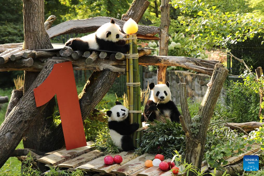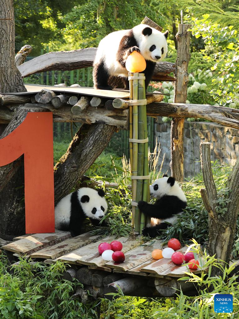 Giant pandas Leni (R, Bottom) and Lotti (L, Bottom), known in Chinese as Meng Hao and Meng Tian, and their mother Meng Meng are seen at Zoo Berlin in Berlin, Germany, on Aug. 22, 2025. A bright red wooden "1", colorful ice treats made from beetroot and carrot juice, and a bamboo stick for a birthday candle ... this was the scene in Zoo Berlin's panda enclosure on Friday as twins Leni and Lotti marked their very first birthday in true panda style. Born on Aug. 22, 2024, Leni and Lotti, known in Chinese as Meng Hao and Meng Tian, are the second pair of giant pandas ever born in Germany. Their parents, Meng Meng and Jiao Qing, arrived in Berlin from the Chengdu Research Base of Giant Panda Breeding in China in 2017. (Xinhua/Du Zheyu)