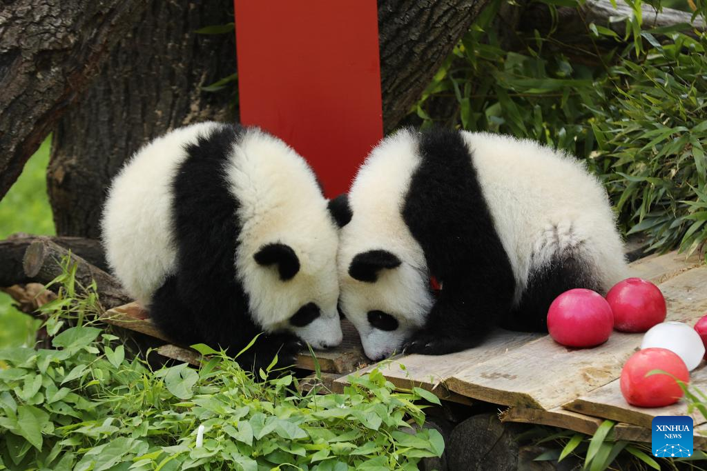 Giant pandas Leni (L) and Lotti, known in Chinese as Meng Hao and Meng Tian, are seen at Zoo Berlin in Berlin, Germany, on Aug. 22, 2025. A bright red wooden "1", colorful ice treats made from beetroot and carrot juice, and a bamboo stick for a birthday candle ... this was the scene in Zoo Berlin's panda enclosure on Friday as twins Leni and Lotti marked their very first birthday in true panda style. Born on Aug. 22, 2024, Leni and Lotti, known in Chinese as Meng Hao and Meng Tian, are the second pair of giant pandas ever born in Germany. Their parents, Meng Meng and Jiao Qing, arrived in Berlin from the Chengdu Research Base of Giant Panda Breeding in China in 2017. (Xinhua/Du Zheyu)