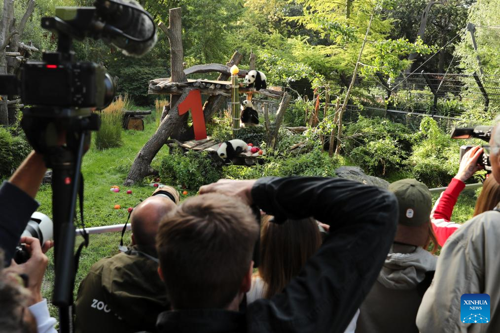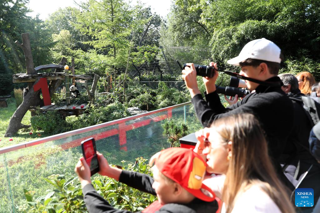 People take photos of giant pandas at Zoo Berlin in Berlin, Germany, on Aug. 22, 2025. A bright red wooden "1", colorful ice treats made from beetroot and carrot juice, and a bamboo stick for a birthday candle ... this was the scene in Zoo Berlin's panda enclosure on Friday as twins Leni and Lotti marked their very first birthday in true panda style. Born on Aug. 22, 2024, Leni and Lotti, known in Chinese as Meng Hao and Meng Tian, are the second pair of giant pandas ever born in Germany. Their parents, Meng Meng and Jiao Qing, arrived in Berlin from the Chengdu Research Base of Giant Panda Breeding in China in 2017. (Xinhua/Du Zheyu)