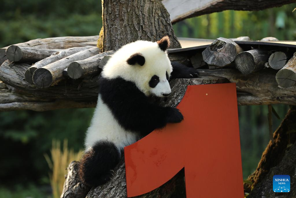 Giant panda Lotti, known in Chinese as Meng Tian, is seen at Zoo Berlin in Berlin, Germany, on Aug. 22, 2025. A bright red wooden "1", colorful ice treats made from beetroot and carrot juice, and a bamboo stick for a birthday candle ... this was the scene in Zoo Berlin's panda enclosure on Friday as twins Leni and Lotti marked their very first birthday in true panda style. Born on Aug. 22, 2024, Leni and Lotti, known in Chinese as Meng Hao and Meng Tian, are the second pair of giant pandas ever born in Germany. Their parents, Meng Meng and Jiao Qing, arrived in Berlin from the Chengdu Research Base of Giant Panda Breeding in China in 2017. (Xinhua/Du Zheyu)
