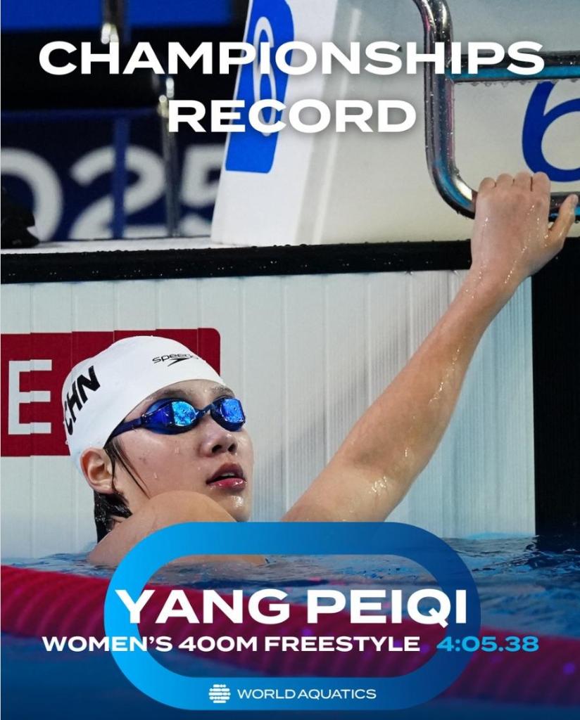 Eighteen-year-old Yang Peiqi of China claimed three gold medals, setting a meet record to win the women's 400m freestyle at the World Junior Swimming Championships held in Romania on August 22.