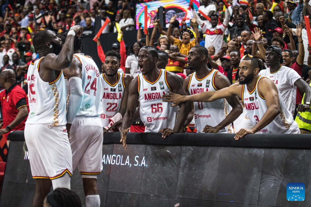 Angola's bench players cheer for teammates during the semifinal between Angola and Cameroon at the 2025 FIBA AfroBasket in Luanda, Angola, Aug. 23, 2025. (Xinhua/Wang Guansen)