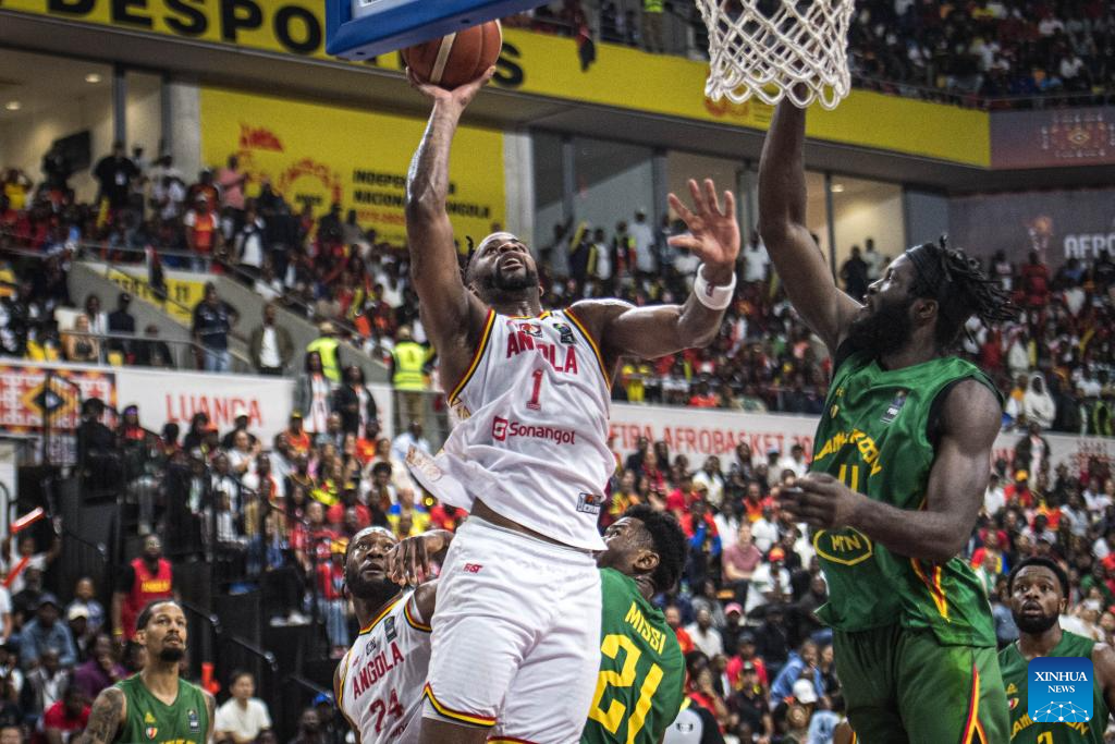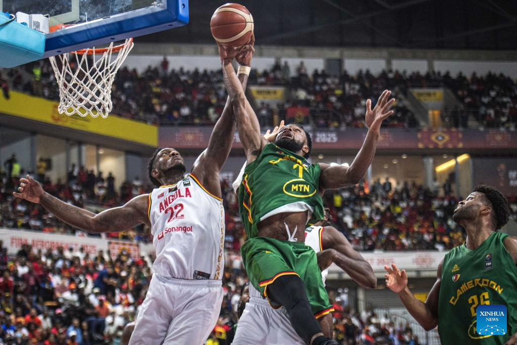 Angola's Eduardo Francisco(C) goes to the basket against Cameroon's Jordan Bayehe (R) during the semifinal between Angola and Cameroon at the 2025 FIBA AfroBasket in Luanda, Angola, Aug. 23, 2025. (Xinhua/Wang Guansen)