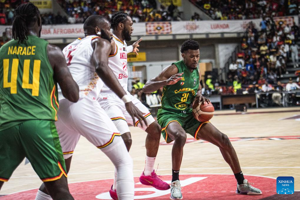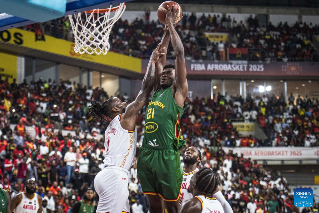 Cameroon's Yves Thierry Ouwe Missi (R) breaks through during the semifinal between Angola and Cameroon at the 2025 FIBA AfroBasket in Luanda, Angola, Aug. 23, 2025. (Xinhua/Wang Guansen)