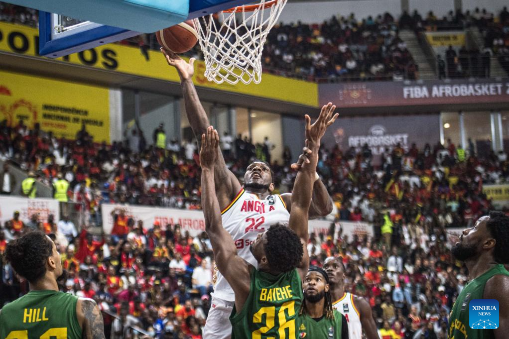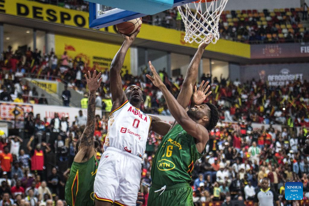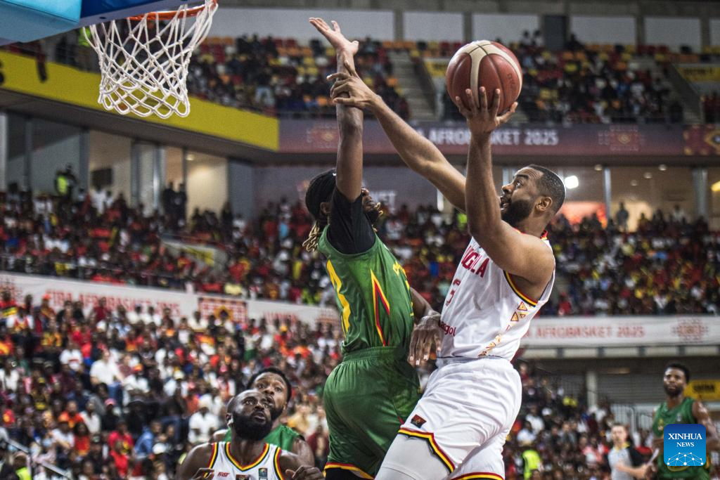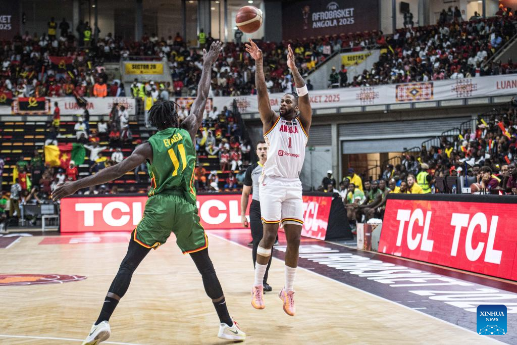 Angola's Selton Miguel(R) makes a shot during the semifinal between Angola and Cameroon at the 2025 FIBA AfroBasket in Luanda, Angola, Aug. 23, 2025. (Xinhua/Wang Guansen)