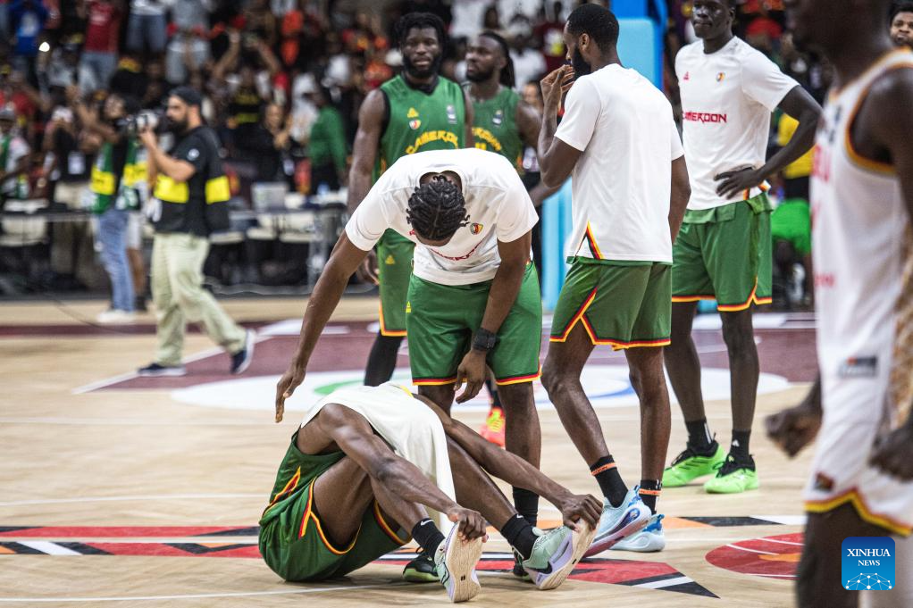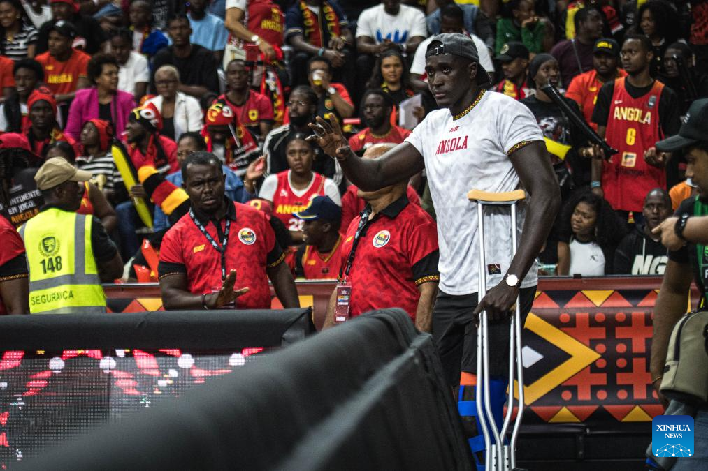 Angola's injured Jilson Bango gestures during the semifinal between Angola and Cameroon at the 2025 FIBA AfroBasket in Luanda, Angola, Aug. 23, 2025. (Xinhua/Wang Guansen)