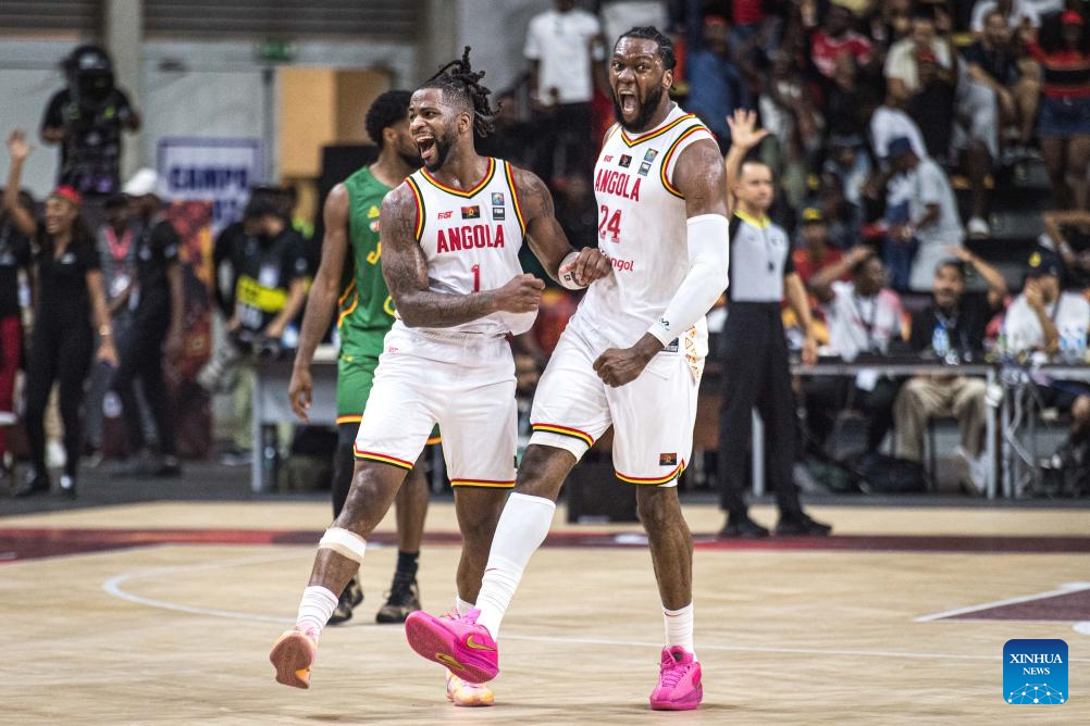 Angola's Selton Miguel (Front L) and Bruno Fernando react during the semifinal between Angola and Cameroon at the 2025 FIBA AfroBasket in Luanda, Angola, Aug. 23, 2025. (Xinhua/Wang Guansen)